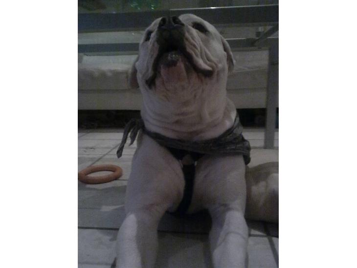 All-white Amerikansk Bulldog. Vores Valentino er en bully, bully'er er lidt lavere og bredere end din standart AB og vejer omkring de 50-60 kg når de er fuldvoksne.