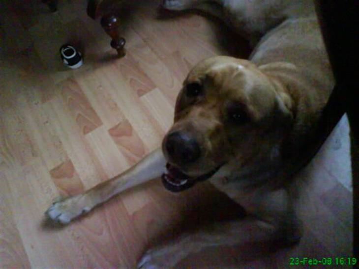 han er mørke gul med fire hvide poter og en hvid halespids. han er meget sød og rigtig meget legesyg. han er blanding af Golden retrieverog en frandsk race. han kommer fra frankrig han har været i danmark i to halv måned. han er kælen. og rigtig glad. han kan godt lide at komme med ud og køre og han elsker at gå tur.