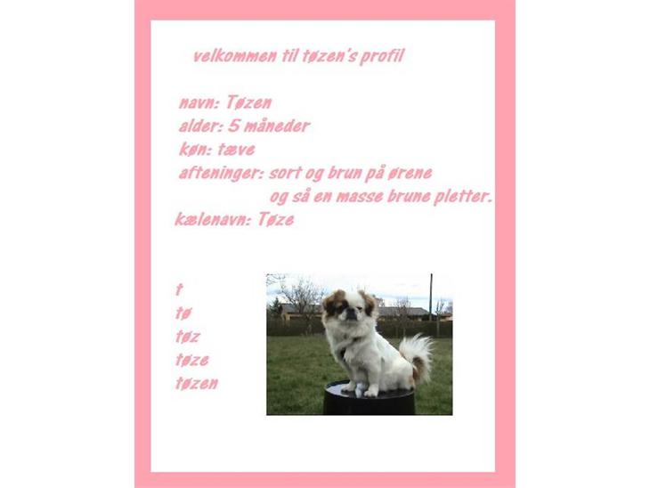 Tøzen hun kan være så sød, men lige som hun kan være så kan hun være noget så fræk, hun bider i blomster løber væk. går og skider i blomsterbedet, og bide alting i stykker, men hun er ved at lære at det må men ikke.