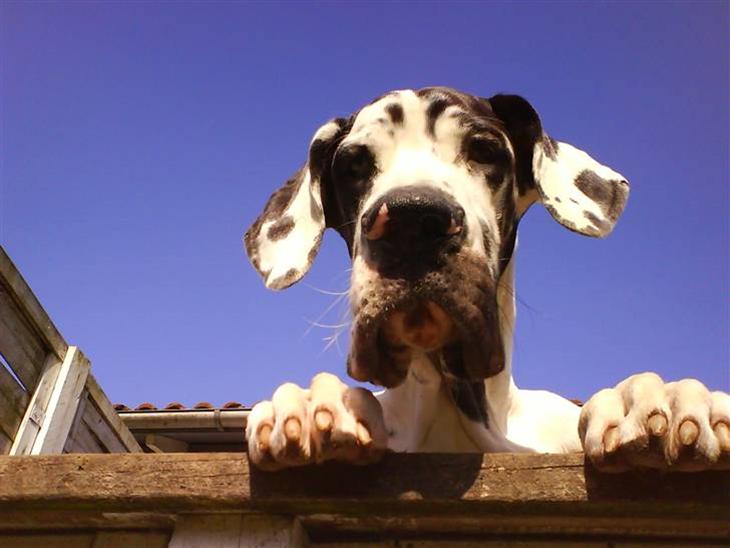 Han er harlekin, og det vil sige han er Hvid med Sorte Prikker, mange tror det en Stor dalmatiner men det er en ægte Grand Danois.
