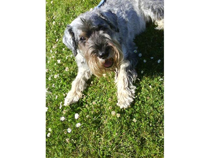 Daisy er en sød mellemschnauzher med farverne salt & Peber.
