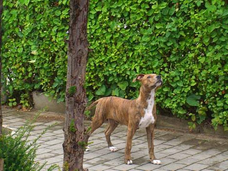 Er blevet mere rolig nu, og hører efter hva man siger, eller....Nogenlunde..... . Den elsker at løbe rundt i haven, og springe rundt...meget komisk at se på.