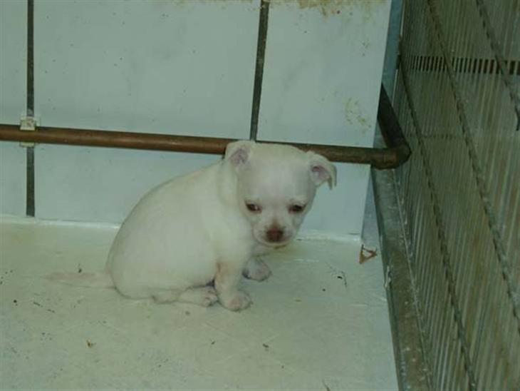 Endelig efter over et år lykkedes det os at få vores lille hund til landet. Og dog! Vi bestilte og betalte ekstra for at få en hvid hund som man kan se på de første to billeder, med perfekt bid, stamtavle og i perfekt stand så hun kunne bruges til avl. Men da hun endelig kom til landet var det en helt anden sag. Vi fik istedet en lille skrækslagen hund, med brækket hale, krumrygget og underenæret, for mange tænder i overmmunden og for få i undermunden samt småsår og hårløse partier. Hvad vi kunne konkludere med det samme var at vi godt og grundigt var blevet snydt. Den hund vi oprindeligt havde købt, var solgt til en anden og i stedet havde vi fået en hund, der var i så dårlig stand den ikke kunne sælges. Men nu var hun kommet hertil og når man tænker på hvilken kummerlig tilværelse hun har levet det første år af sit liv, spærret inde i et bur, sovende på et hårdt betongulv og aldrig set dagens lys og kun været omgivet af en masse andre hunde, så var vi ikke i tvivl om at hun i hvert fald ikke skulle returneres, selvom det ikke var "vores" hund.