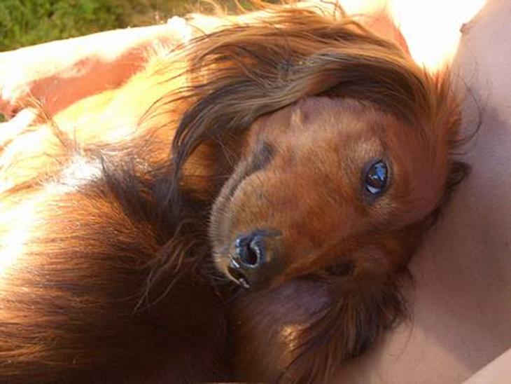 Han er en hund med 4 poter, en på hver sit ben, og bagpå sidder halen fast og vipper......ggg......han er lille og rødbrun, og super charmerende. Folk har svært ved at forbigå hans bedårende øjne, hans venlige sind og hans charmerende ydre (lyder næsten som om jeg beskriver manden i mit liv - ggg) Han er utrolig kontaktsøgende og et rigtigt hængetræ, han elsker at blive nusset om og så ved han ikke noget bedre end at sove i arm under dynen. Basse er dog meget vagtsom, ingen kommer ind udover vi er klar over det, somme tider er selv vinden gennem vinduerne heller ikke velkommen, han elsker at være med ude at køre bil og bliver enormt ulykkelig hvis ikke han kan kommer med.