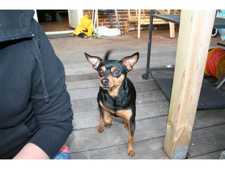 hvor er han fin da :O) er han blandet med chihuahua? han ligner nemli sådan en blanding fordi han har kort snude det har en ren dværgpinscher jo ikke, men smuk er han høj til ham.