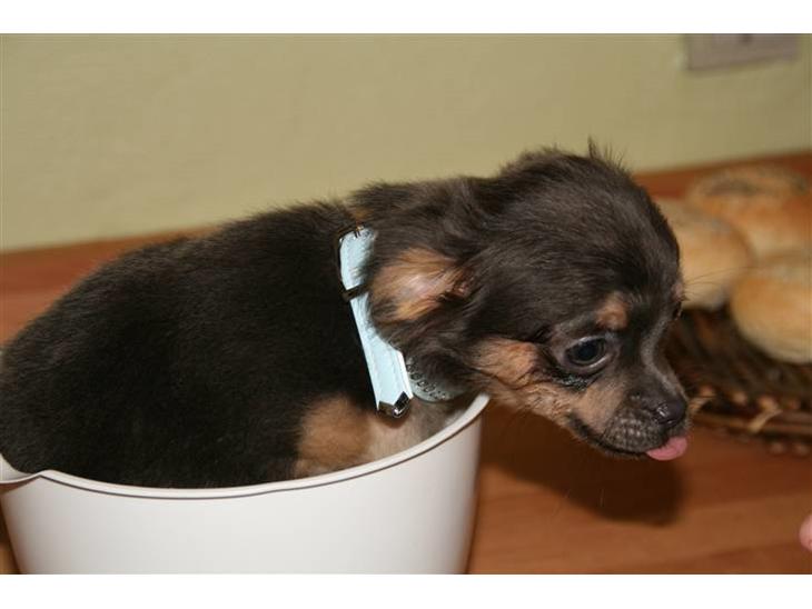 Han er 14 uger og er lige kommet hjem til os i dag, d. 9. marts 2009: 14 cm ved skuldren, og 1840 gram