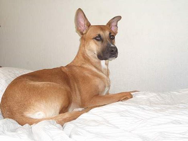 Hun vejer 25kg. Har kort rødlig pels, slanke lange ben, store smukke brune øjne og store ører!
