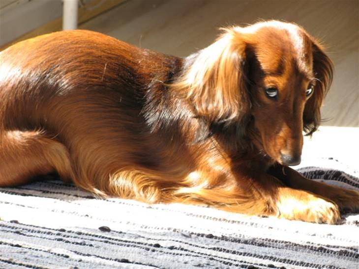 Ja mon ikke....smiler... Er en meget typisk og selv-bevidst lille grav-hunde-dame. Kærlig og fræk, modig og stædig...*SS*