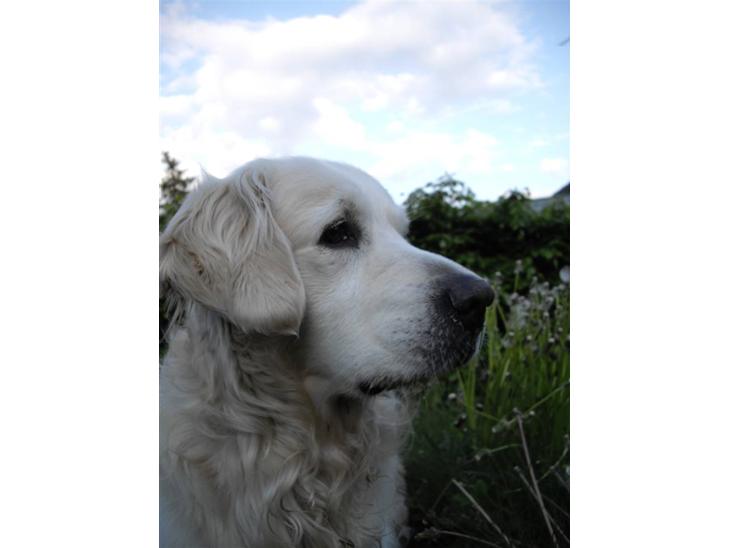 Din skønne hund får da lige en høj af os. Hvor er han flot. Og så er det lidt Golden Music hund i ham. Min Charlie er fra Golden Music og er lidt i familie med faderen til din hund.