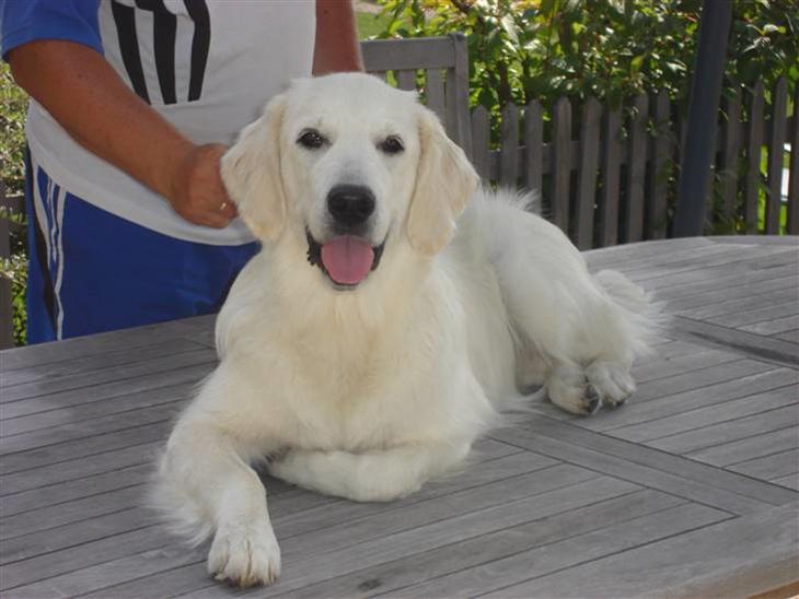 Meget sød og feminin tæve. Sødt hoved. Meget lys kraftig pels ... ikke så mange krøller. Rigtig flot og busket hale...
