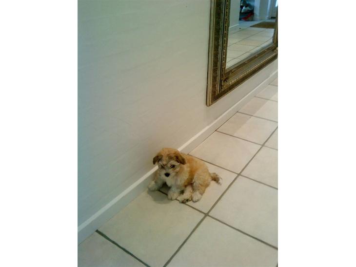 han en meget sød hvalp. men han er også oppe at køre og han sover meget men det er godt så er der ro i huset hi hi. han bider i ting men det er kun for sjov det ved jeg.