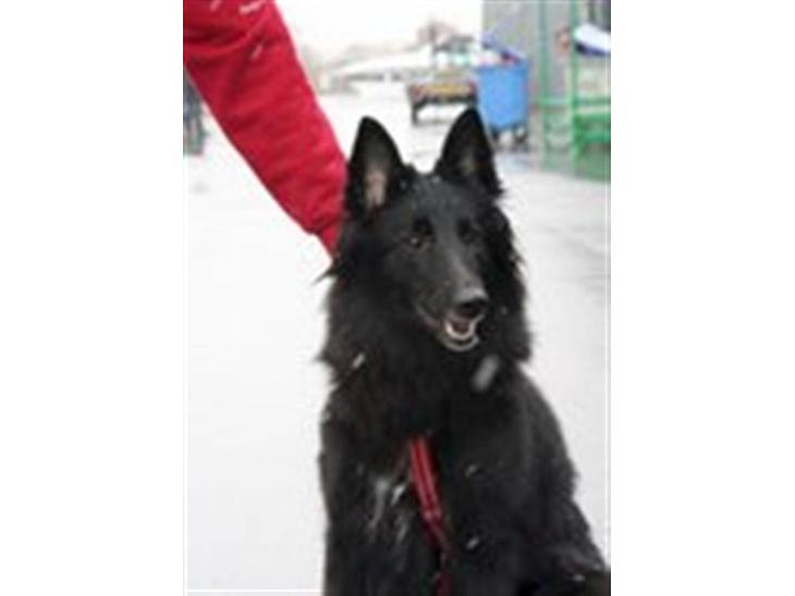 Spinkel Groenendael tæve. Sort, med en hvid plet på brystet og lidt hvidt på tæerne