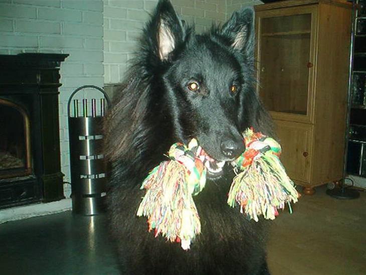 Santos er meget lærenem. Hvis jeg skal smide noget i skraldespanden, f.eks. en tom cigaretpakke, giver jeg den bare til ham og han render ud med den. Han kan alt, sitte, lægge sig, spille død og meget andet.