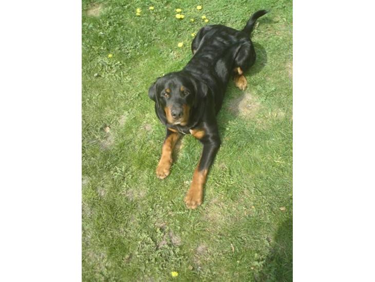 er et år gammel han er blanding mellem 50% Rottweiler 50% Berner sennen .. .. han linger en Rottweiler men hans sind ligger mest efter Berne sennen .. .. han er en stille og rolig hund glad for andre hund og mennesker og ikk mest børn han er i den aldre hvor damerne er spænde .. .. er der noget i vil vide om Dolce skriv gerne til os .. ..