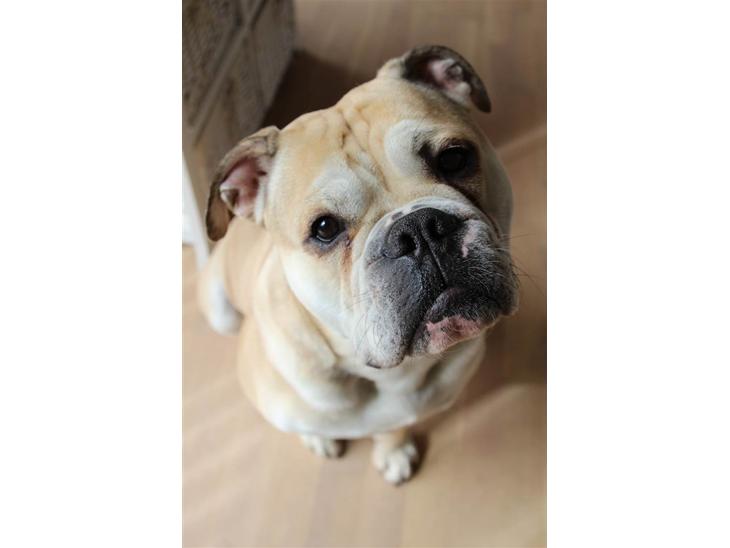 den smukkeste olde english bulldogge, som jeg nogensinde har set, vildt lækker farve og total charmetrold, så må altså ændre til en X-Høj til den lille prins :o))) ..har tidligere været forbi...