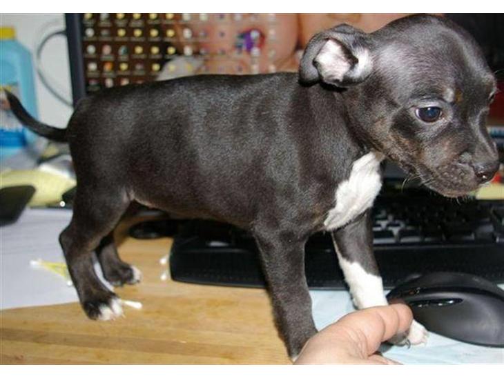 Dejlig lille sort tæve med hvide stafferinger ved bryst og ben!