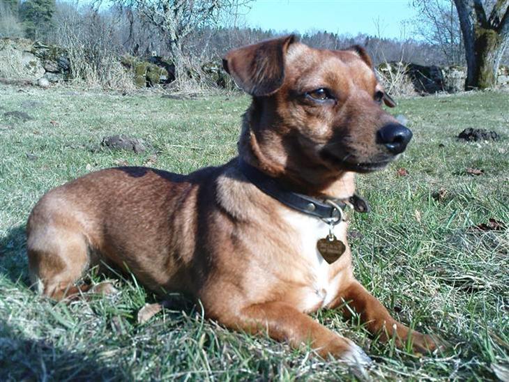 Hun ligner dog en gravhund med lidt længere ben. Hun er efterhånden blevet ret ligeglad med andre hunde og følger altid os. - medmindre hun ser en hare eller andet vildt, så går jagten ind og så må man bare vente, nogen gange i LANG tid før hun pludselig kommer løbende tilbage. Men ellers meget loyal og omsorgshungrende. Vi overtog hende fra en rar polak mand som efterhånden havde taget for mange hunde til sig for at rede dem fra dårlige ejere. Stinky har antageligt fået dårlig behandling fra valp af, men nu er der kun kærlighed til lille Stinky og jeg tror Stinky har det ganske godt... Kostede tre flasker rødvin.