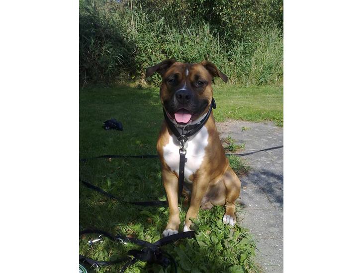 Han ser flot og dejlig ud, men Amerikansk Bulldog er han desværre ikke - så du skal nok have ham ind under blandinger...