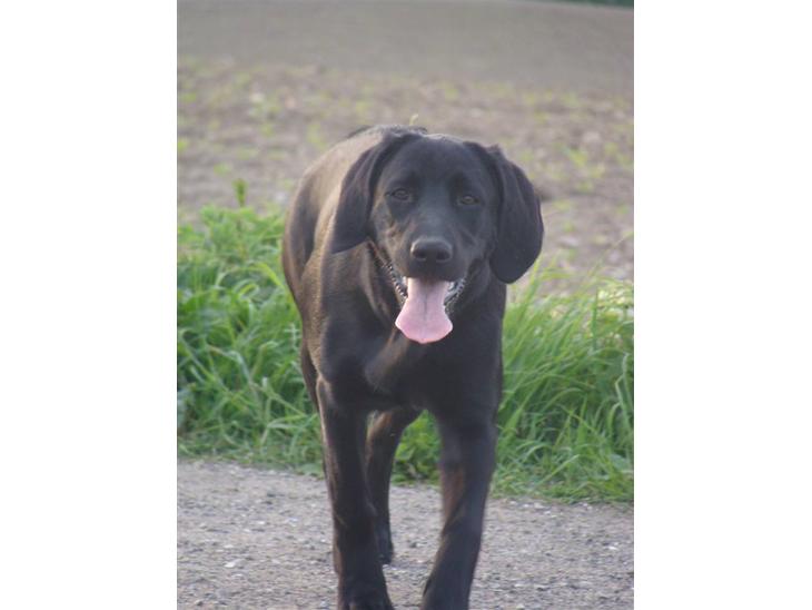 Hun er blandet mellem en labrador og en langhåret hønsehund, og hun er lige imellem, så en dejlig højde.