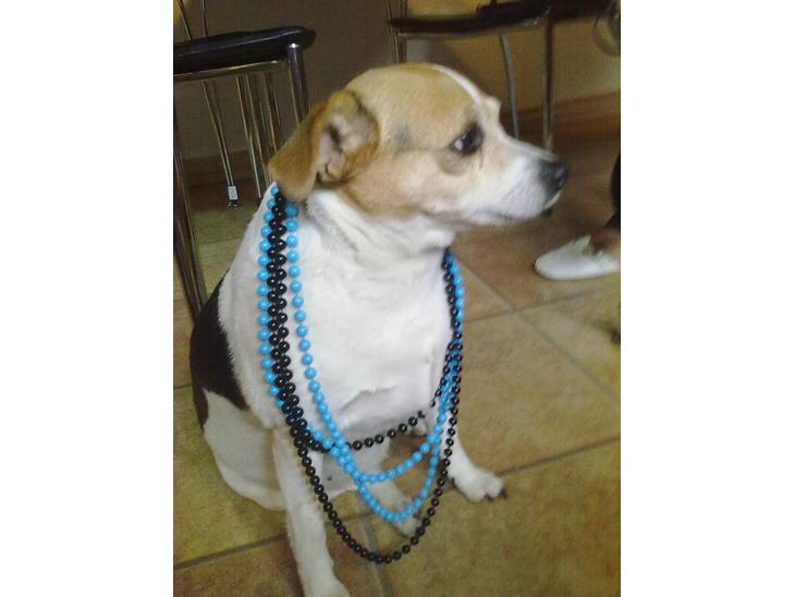 Molly ser rigtig fin ud med de perlekæder. Høj er sendt herfra.