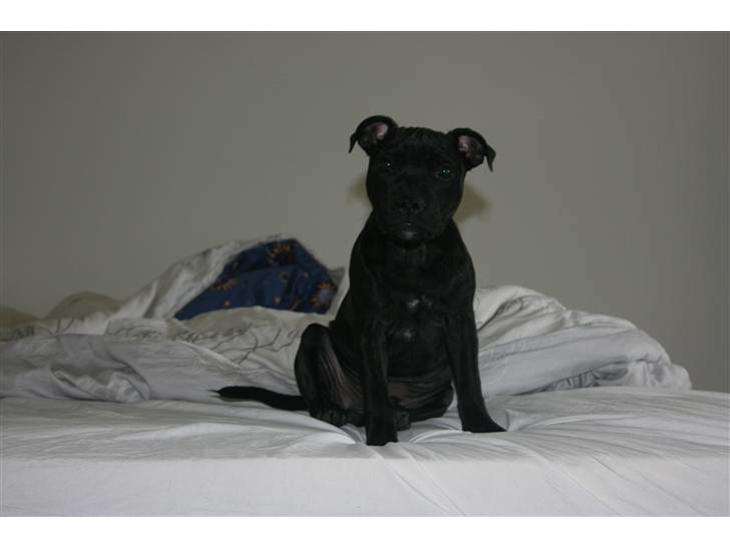 Han ser meget pæn og harmonisk ud, meget muskuløs nakke, front og bag og så han ellers bare slank, og så har han en lille krølle på halen. dejlig vovse:-)