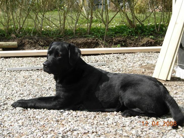 Kiki er en blanding af en lab. og en bokser. Hun har bokser underbid og om sommeren kan man skimte lidt brun på bag partiet på hende fra bokseren. men ellers har lab. slået meget i gemmem på hende.