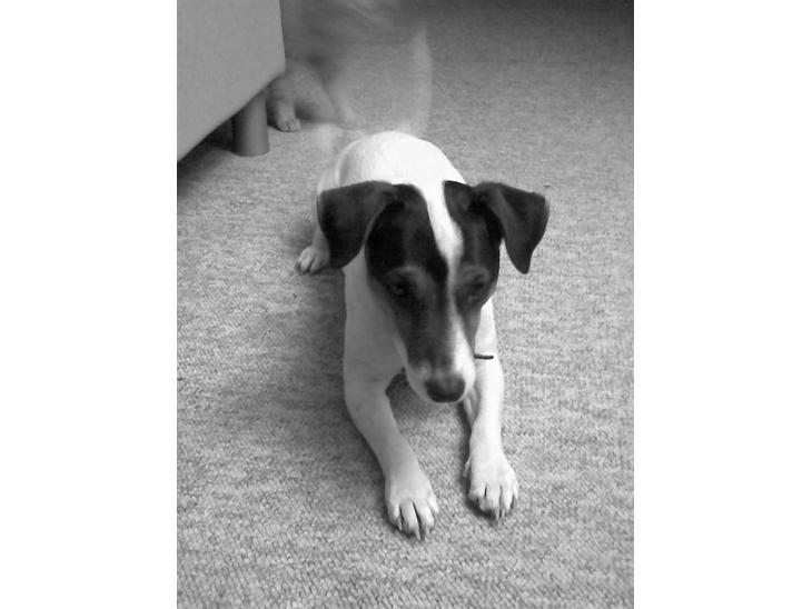 Jackie har 2 sorte øre med delt sort hoved. Ingen andre pletter. Hun er go til at hente ting