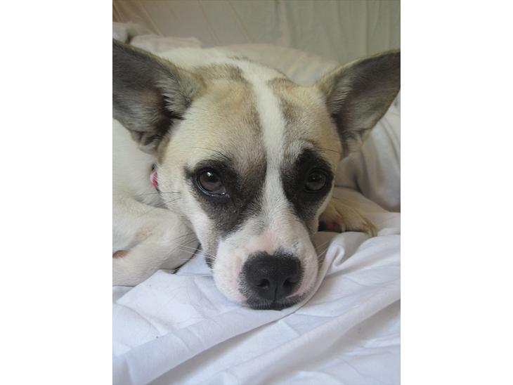 Hun har et meget specielt udseende, jeg har aldrig set en hund som ligner hende, en rigtig heldig designerhund(gadekryds). Vores dyrlæge mener hun er så skøn at man burde fremavle en race som hendes, japansk bulldog :-)