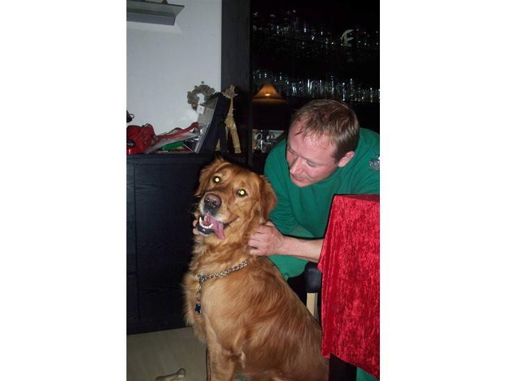 men hele historien starter med at min kæreste ønskede sig en hund og en golden var altså kun det der kunne bruges, så sad jeg for sjov og kiggede for et par dage siden og faldt over han annonce og faldt for ham med det samme, så vidste jeg ham til kæresten og han gjor han os, så jeg skrev til dorthe og så skrev vi lidt og så ringede jeg til hende i dag og så endte det med at dorthe og hans mand kom med ham i dag ved en 3 tiden og så har han været her siden og vi er allerede rigtig glad for ham og glæder os til at lære ham og kende:)