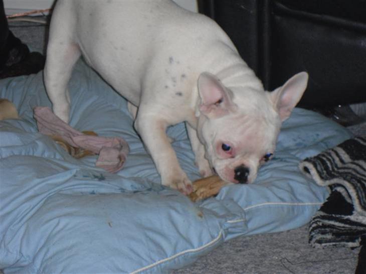 Hun er desværre døv, og derfor er der intet der skræmmer hende, men hun kan så heller ikke mærke hvor hårdt hun egentlig bider . Det har dog været en fordel for hende mht. drengene, men men vi tobenede har da haft ondt i hånden et par gange. eftersom hun jo heller ikke kan høre hvor højt hun skriger og gør, så har vores ører også været lidt på prøve. :)