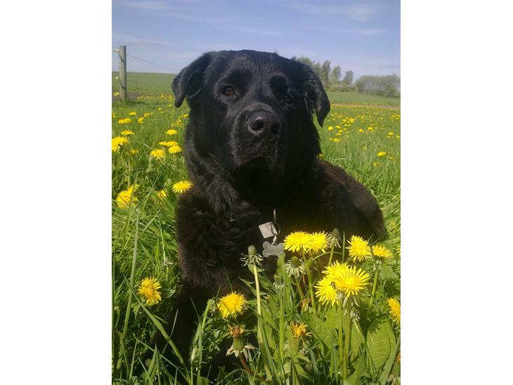 Ren rundkørsel. Noget blandning af labrador, bordercollie, samojede og mener måske der kunne være en smule rottweiler i ham også.