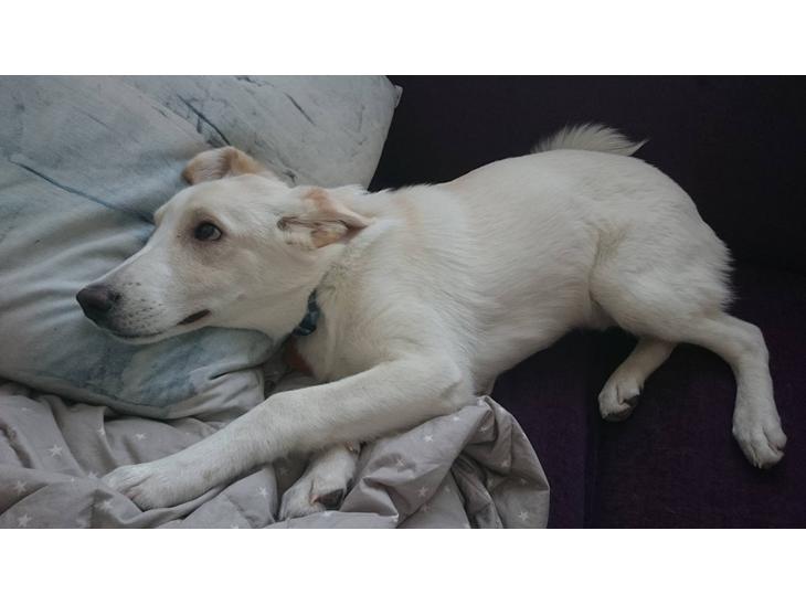 Han er en god hun som lystre pænt. og kan nogle små ting som at sidde,vente,ligge,gi pote.og løbe efter katten er han god til.
