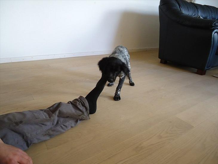 Diablo som han hedder, var en lille buttet og meget fræk hvalp da vi hentede ham startede han med at spise mine sko ;)
