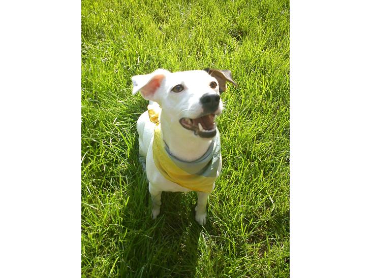 udsende: hvid med et sort øre, og en stor sort plet på ryggen.