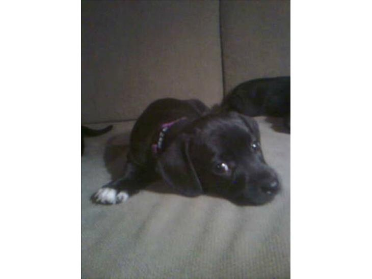 Hun er sort med lidt hvidt på brystet, lidt hvid på hver pote og 6 hvide hår på halespidsen. og så har hun en "stribe" hvidt på hagen.