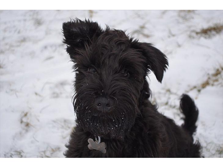 Han er helt sort, med lidt hvide stik hår på brystet.