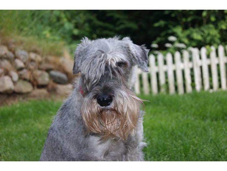 Hun er en lille spinkel mellemschnauzer. Hendes pels er meget ru og mørkere end sin søsters. Fine mørke briller omkring øjnene.