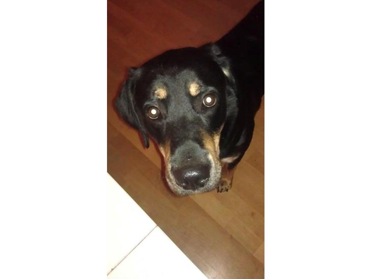Han er blanding af labrador og rottweiler. Han ligner en labrador med rottweiler aftegninger.
