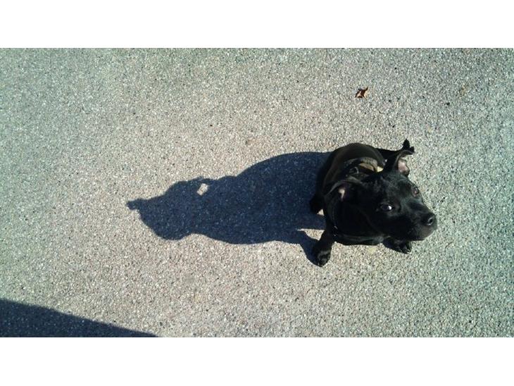 Sort lille SBT tæve med fuld fart på. hun er ikke den største af sin race men har det samme gode sind og temperament som racen er kendt for:)