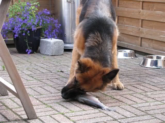 Én enkelt gang lykkedes det Bonnie at spise 500 g sildefileter UDEN de var klippet ud. Straks hun havde spist, bad hun om at komme ind - hun spiser altid på terassen.