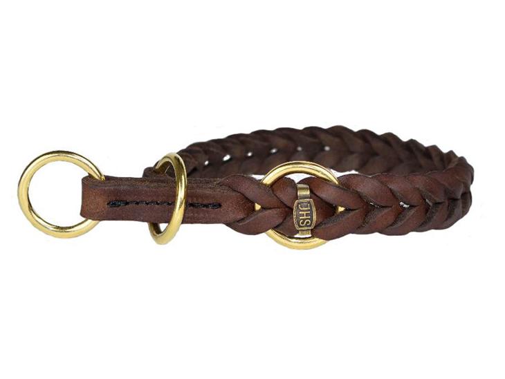 Flettet i brunt læder og med messing ringe og med halvkvæl med stop.