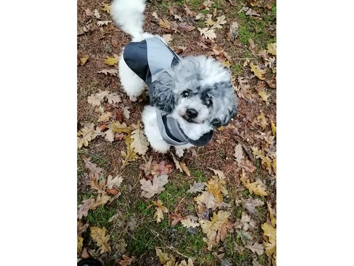 Sjælden harlekin puddel, da han har 4 farver: hvidt, sort, lyse brun og sølv.