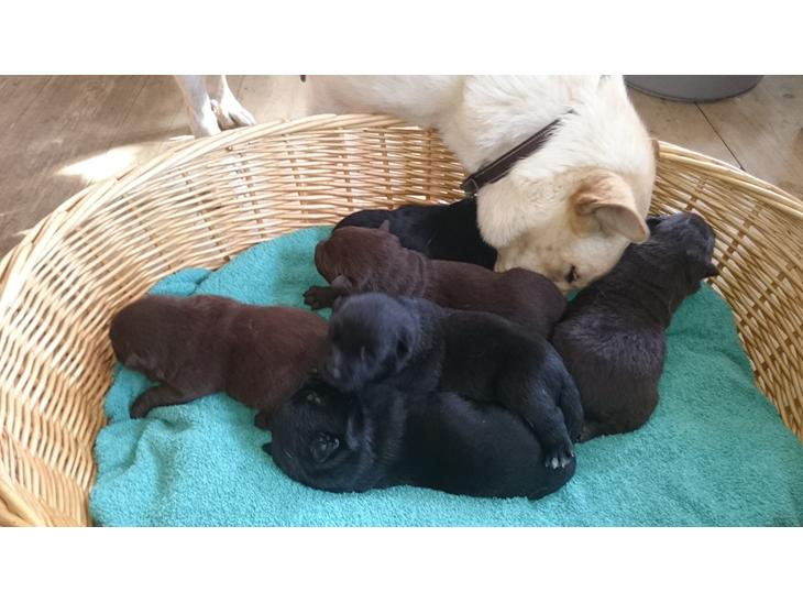6 hvalpe, 4 hanner og 2 tæver født 29/6 2017. Der er 3 sorte og 3 chokoladebrune, 1 tæve og 2 hanner af hver farve. Klar til afhentning 24/8.